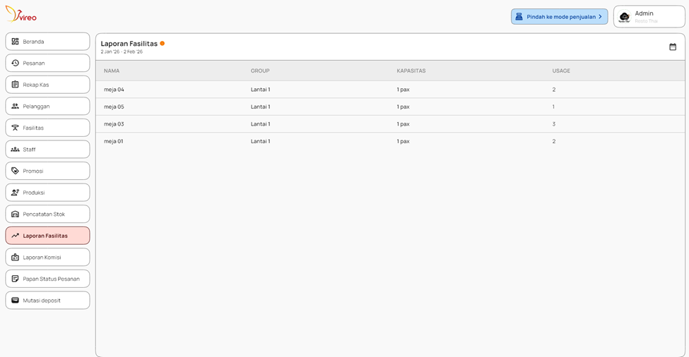 Laporan Fasilitas adalah fitur yang menampilkan daftar lengkap meja di restoran/café beserta status penggunaannya secara real-time. Laporan ini menunjukkan nama meja (misal: Meja 01, Meja 02), kapasitas maksimal (berapa orang yang bisa duduk), dan jumlah tamu yang sedang menggunakan meja tersebut. Dengan laporan ini, staf dapat langsung melihat meja mana yang masih kosong, sedang dipakai, atau bahkan kelebihan kapasitas (misal: meja untuk 2 orang dipakai 3 orang). Fungsinya sangat praktis: mempercepat penempatan tamu baru tanpa perlu keliling ruangan, mencegah kelebihan muatan yang membuat tamu tidak nyaman, serta membantu mengatur antrian secara efisien. Intinya, laporan ini menjadi “peta hidup” operasional harian yang memastikan setiap meja dimanfaatkan secara optimal dan tamu dilayani dengan cepat.