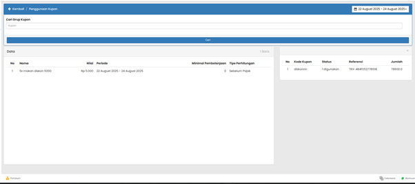 - Referensi: Nomor struk atau ID transaksi tempat kupon ini dipakai, yaitu TRX-4B4FE5377859E.