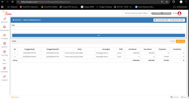 | Tanggal Berakhir | : Waktu akhir shift / sesi kas ditutup |