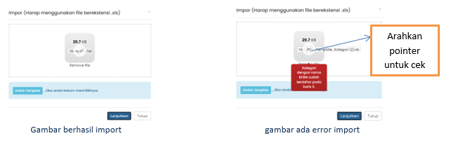 Text Box: Unduh templateText Box: Dop file disini Gambar importKlik unduh TemplateMaka akan otomatis mengunduh template file modul grup produkIsi template fileIsi sesuai contoh pada file templateSimpan kemudian drop file di import dan klik LanjutkanKlik Tutup jika kembali ke menu awal