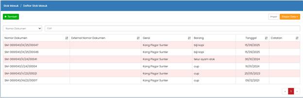 Tabel daftar stok masuk menampilkan:- Nomor Dokumen