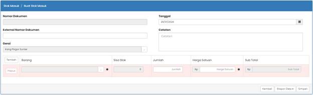 Halaman Buat Stok Masuk digunakan untuk mencatat detail penerimaan atau penambahan stok barang.