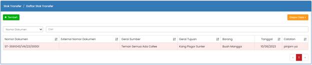 Tabel daftar stok transfer menampilkan informasi:- Nomor Dokumen: Nomor unik yang dihasilkan sistem