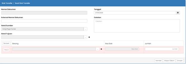 Halaman Buat Stok Transfer digunakan untuk mencatat perpindahan barang dari satu gerai ke gerai lainnya.